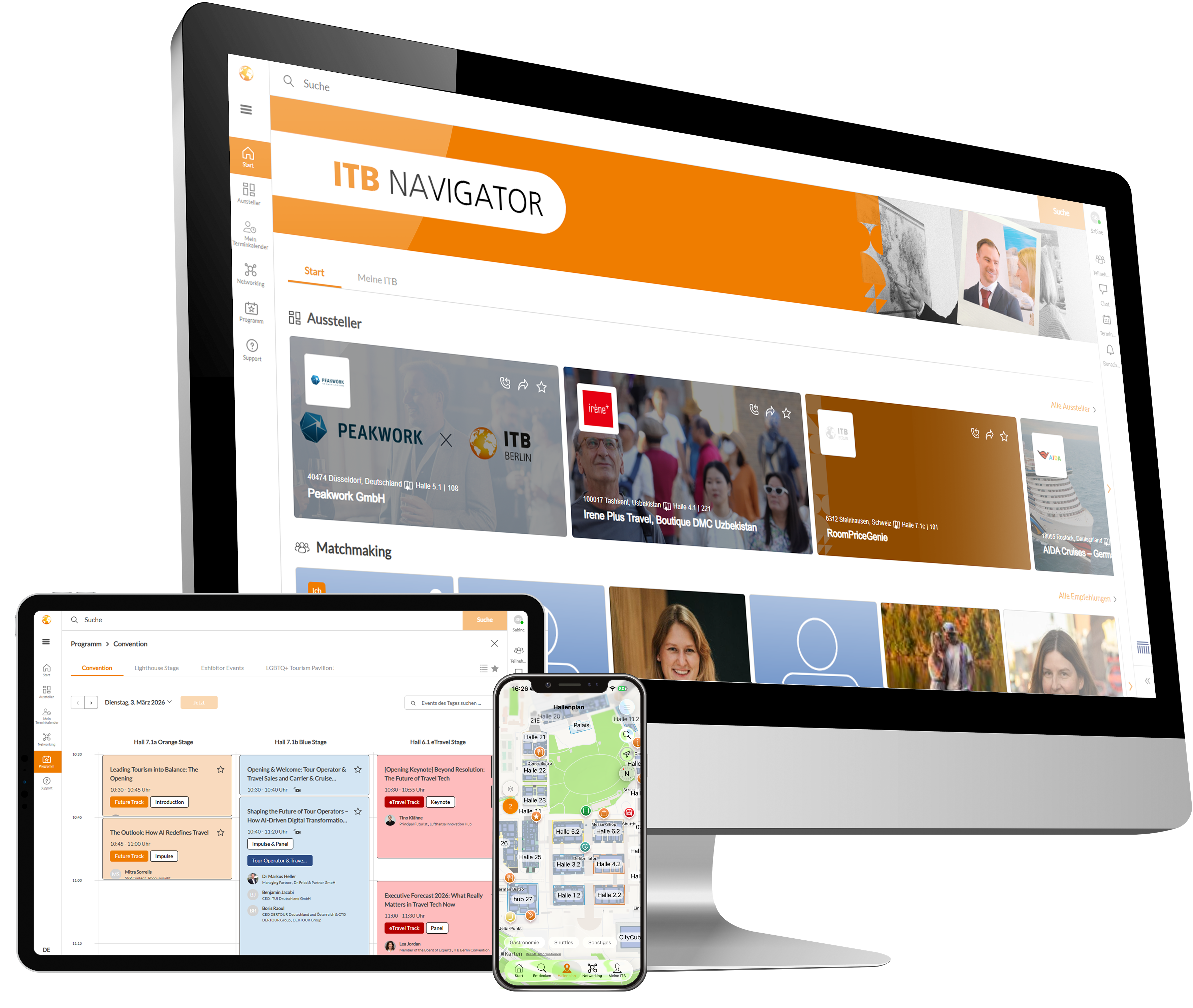 | Haben Sie schon beim ITB Navigator vorbeigeschaut? Dort erwarten Sie nützlichen Tools und Hilfmittel für die Planung Ihres Messebesuchs: | | • Aussteller- und Teilnehmerübersicht inklusive Matching- Vorschlägen • Networking mit anderen Nutzern • Terminvereinbarungen • das Event- und Kongressprogramm • Livestreams • der interaktive Hallenplan |