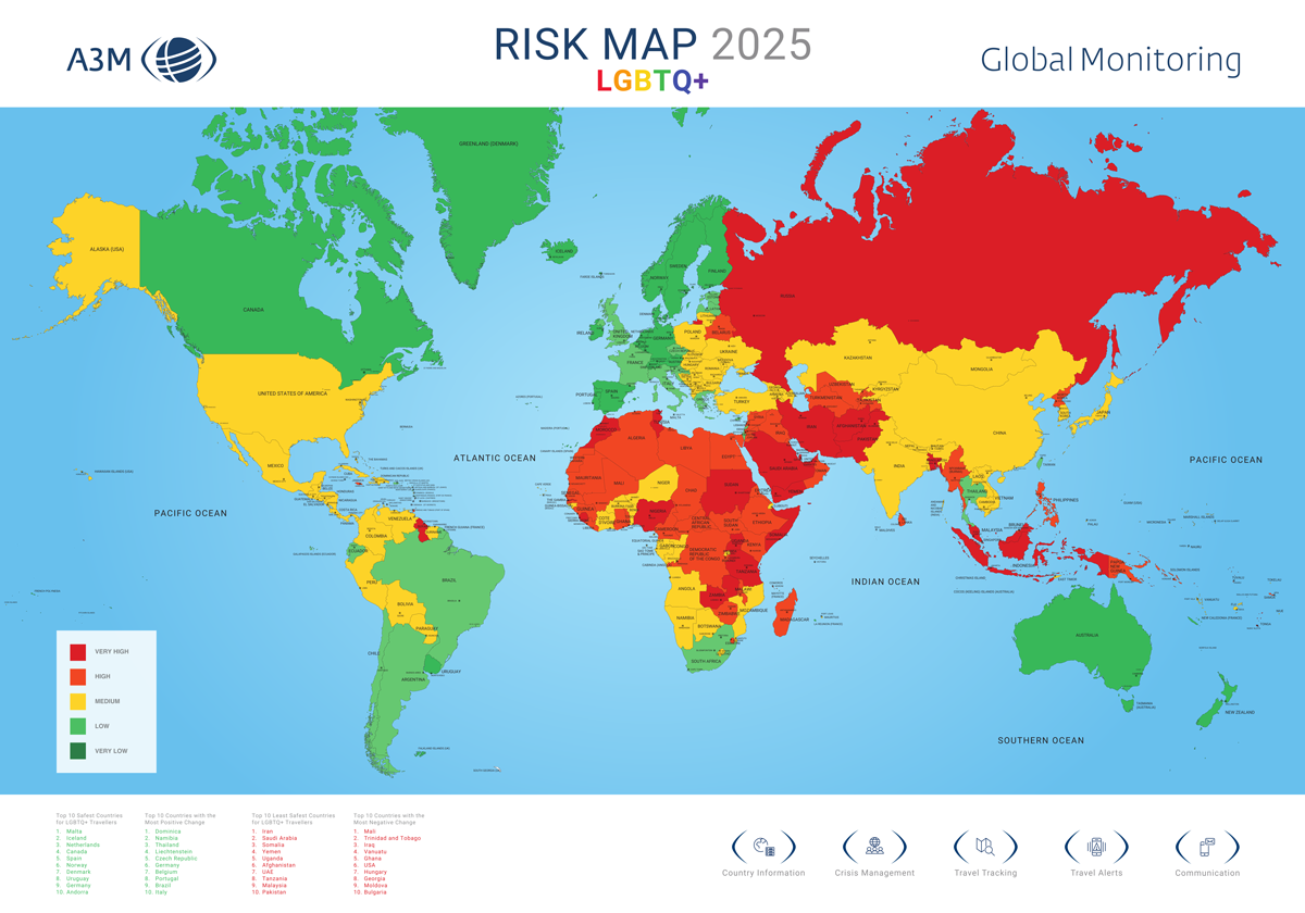 While Canada and Spain are consistently perceived as safe, social acceptance in Germany remains rather cautious, despite equal legal rights. The USA on the other hand reflects a deep divide – where regional differences are evident. A3M has now published its latest LGBTQ+ Risk Map 2025 documenting developments worldwide.